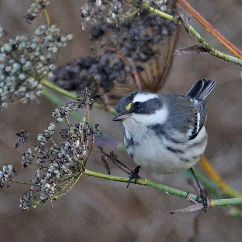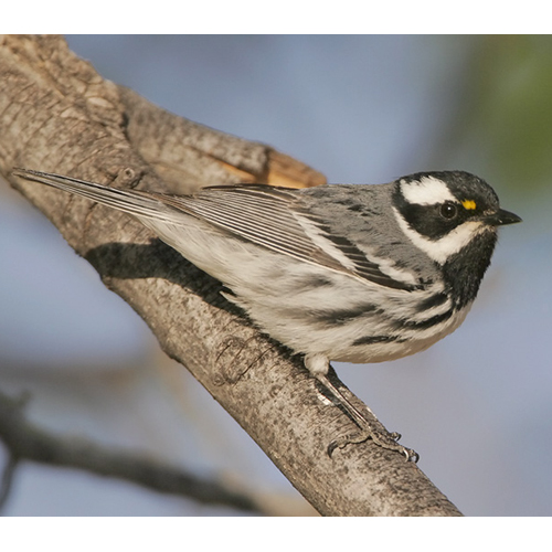 Black-throated Gray Warblers associate with mixed feeding flocks, especially during migration. They spend much of their time in the treetops, although when they are found lower down, they are not extremely wary and can be observed closely. They use a variety of foraging styles; most commonly they glean food from foliage while they climb about on tree limbs.