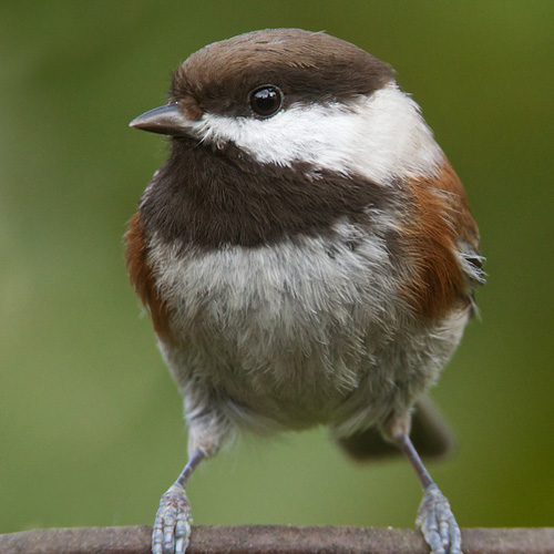 During the breeding season Chestnut-backed Chickadees are territorial, but they join mixed-species flocks in winter. They forage by hopping along twigs and branches and gleaning their surfaces or by probing into bark crevices for food. They often hang upside-down to get at the undersides of branches and needles. They readily come to seed and suet feeders. Chestnut-backed Chickadees store food in the fall and retrieve it in winter.