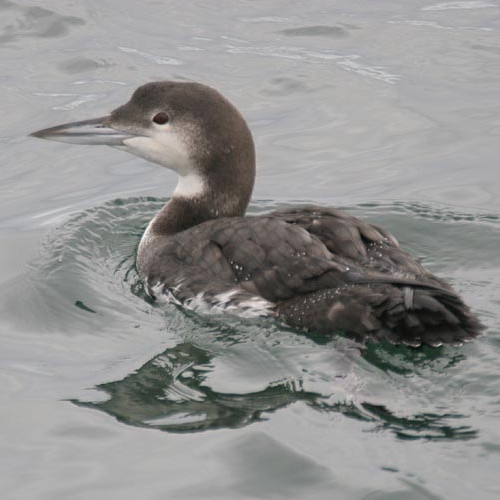 Common Loons are large water birds with thick necks and sharp bills. In breeding plumage, both sexes have striking black heads with white collars, white breasts, and black backs with white checkering. Adults in non-breeding plumage are brownish gray with white throats and breasts, partial white collars, and white around the eyes. Under-parts are white in all plumages. Juvenile plumage is similar to non-breeding.