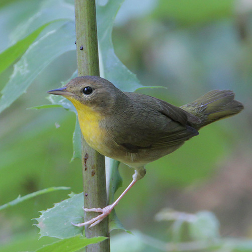 Like many birds that inhabit dense undergrowth, Common Yellowthroats sometimes cock their tails up. They forage low, mostly gleaning prey from the foliage, but sometimes flying out to catch aerial prey, or forage on the ground. During the breeding season, males often perch on a tall stalk to sing, and flick their wings and tails to attract females.