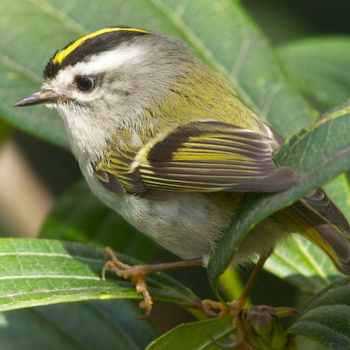 Golden-crowned Kinglets are fairly easy to see during the winter when they flock with other small birds and can occur in large numbers. They are often found foraging high in the canopy, where they hover in front of and under branches or hang from twig-tips to glean food from their undersides and from the undersides of leaves. They also fly out to catch tiny, flying insects. Their flight is quick and fluttery, and they frequently flick their wings. In winter and on migration they often forage much lower.