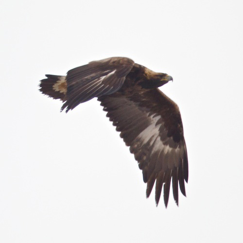 Golden Eagles are solid brown as adults, with golden highlights on their heads, the leading edges of their wings, and their legs. The juvenile has a white patch on each wing and white at the base of its tail. Both the juvenile and the adult have golden plumage at the napes of their necks. Golden Eagles are similar in size to Bald Eagles, but with smaller heads and bills. They have feathers down their legs to their toes.
