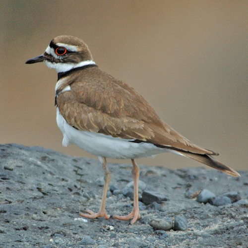 The Killdeer is the largest of the ringed plovers, and the only plover in its range with a double breast band. Killdeers have brown upperparts, white underparts, and orange rumps. Adults and juveniles look the same year round, but young, downy chicks have a single breast band. In flight, the Killdeer's long, slender wings have conspicuous white wing stripes.