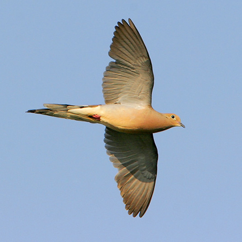 Mourning Doves forage mostly on the ground, visit bird feeders, and often roost on telephone or power lines. In July and August before migration, they form post-breeding flocks. The Mourning Dove produces a mournful hooting, which is often mistaken for an owl.