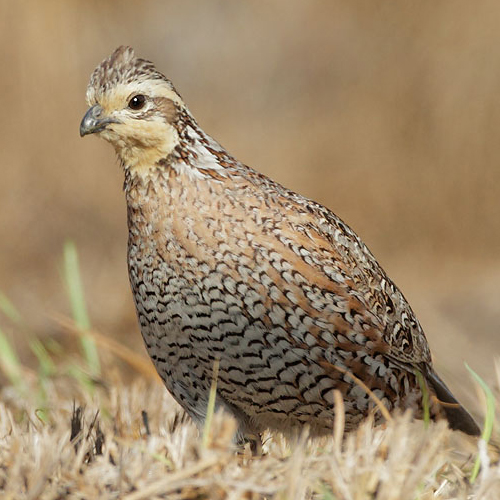 A round-bodied, ground-dwelling bird, the Northern Bobwhite was introduced into Washington from the eastern United States. Highly streaked and cryptic, the Northern Bobwhite is patterned in shades of brown varying from rufous, to chocolate, to tan. A light-colored throat and eyebrow band are distinctive marks. This is the only quail in Washington that is uniformly streaked in brown. Males and females appear similar, but males have less streaking on their breasts, and their eyebrows and throat bands are white instead of tan.