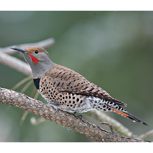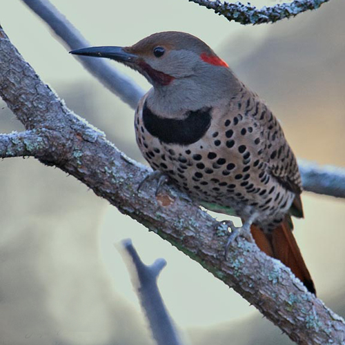 Unlike most other woodpeckers, Northern Flickers are principally ground feeders, though they also forage on tree trunks and limbs. They have a strongly undulating flight pattern, and they can be easily identified in flight by this pattern and their prominent white rumps. Their whinny call sounds somewhat like laughter. They also give a distinctive call that is often transcribed as klee-yer.