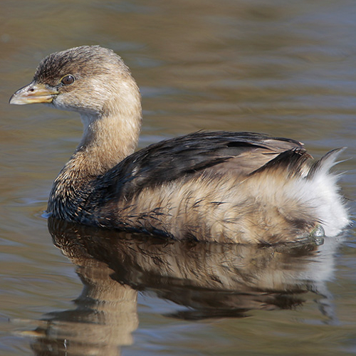 A small grebe with a thick, relatively short bill, the Pied-billed Grebe is grayish-brown with lighter underparts. Juveniles and adults have similar plumages, but during the breeding season adults have black at the throat and a whitish bill with a black band.