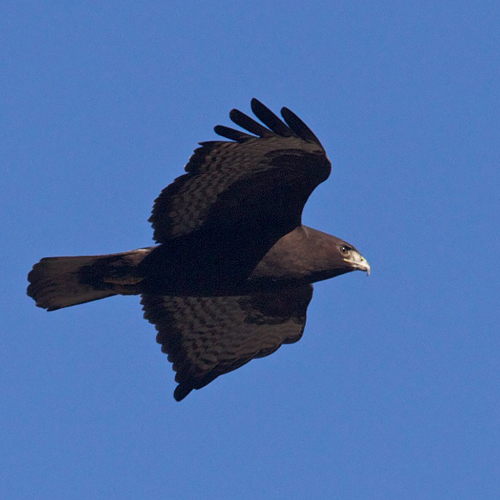Red-tailed Hawks, especially in the West, have highly variable plumage, including dark and rufous phases. They have long, broad wings and short, wide tails. Most have light breasts and dark streaks forming a mottled 'belly-band.' Most have dark brown heads. The underwings are mottled dark and light. All plumages of Red-tailed Hawks have a darkish band on the leading edges of the inner underwings, known as the 'patagial' markings. The upper side of the tail of most adult birds is deep rufous, although the Harlan's Red-tailed Hawk, a subspecies occasionally seen in Washington, has a light gray or banded tail. Light birds often have a faint white 'V' on their back-feathers that can be seen when they are perched. Juveniles lack the red tail.