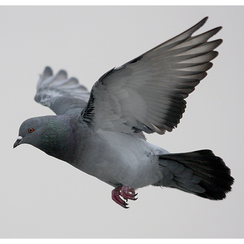 Rock Pigeons are fast fliers and are usually seen in flocks. They forage mostly on the ground, but occasionally forage in trees as well. Unlike their agile, native cousin, the Band-tailed Pigeon, Rock Pigeons move about only clumsily in trees. Large groups often congregate along utility wires, window ledges, and rooftops.