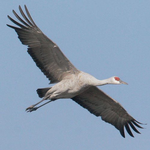 Sandhill Cranes are big birds, with long legs and necks, long pointed beaks, and wingspans which can be over six feet. Adults are gray with red crowns. Juveniles are gray, washed with brown. During the breeding season, the gray plumage of the adults is often stained brown with mud. A "bustle", which covers the short tail, is composed of long, drooping inner wing feathers (tertials and inner secondaries.)