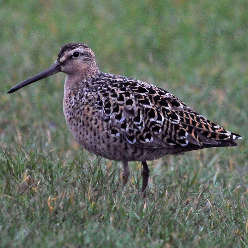 Short-billed Dowitchers can often be found in very large, dense flocks. They feed by probing their long bills into mud or shallow water. Their bills are full of nerve endings, useful for sensing prey. They walk along slowly, lifting their heads up and down like a sewing machine. The call is a sharp, low, two-syllable whistle, easily distinguished from the high peeping of the Long-billed.