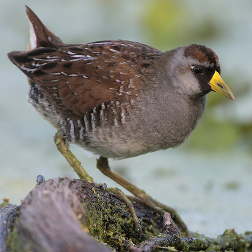 The Sora has a stubby yellow bill, a black facial mask, and a black throat. Its body is grayish-brown with white speckles. Males and females have similar plumage, but females are slightly smaller. In flight, their long wings have a pale trailing edge.