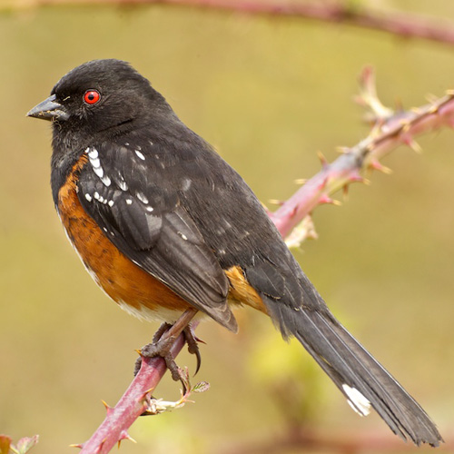 Mainly a ground-forager, the Spotted Towhee uses a two-footed scratching method, kicking both feet backward at the same time to locate food under the litter. This movement is often quite loud, and when the birds are in thick cover, the sound of them foraging is one of the best ways to locate them. Towhees prefer to forage in areas with a thick layer of leaf litter and a screen of foliage and twigs low to the ground. These birds sometimes forage in trees as well, a practice that is most common in spring. Spotted Towhees occasionally sun themselves, lying down on the grass with feathers spread. They have several distinctive calls and songs, and readily respond to 'pishing.'