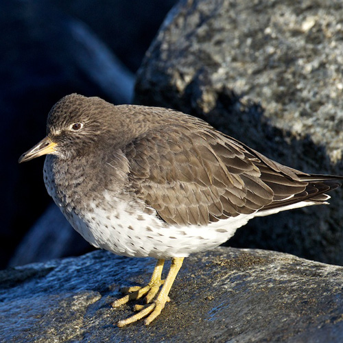 The Surfbird is a plump shorebird with a short, plover-like bill, gray above and orange below. Its gray wings show prominent, white wing-stripes in flight. The tail has a white base with a black subterminal band. In breeding plumage, the Surfbird has salmon-colored patches on its wings. These fade considerably during the breeding season, and may be peach or almost white by the time the birds return to Washington in the fall. Birds in breeding plumage are covered with a wash of dark spots, giving them an overall speckled appearance. The juvenile is gray with white-edged feathers and a breast flecked with white. The adult in non-breeding plumage is also gray, but lacks the white-edged feathers and has no streaks on its breast.