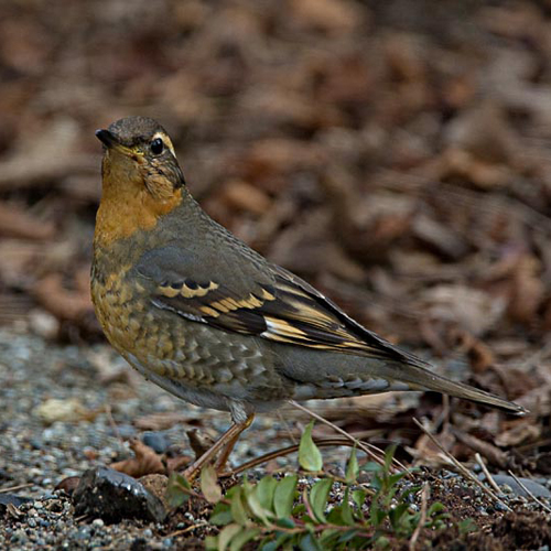 The Varied Thrush is similar in behavior to the American Robin, but more elusive. Much of its foraging is done on the ground, usually in dense cover, although sometimes it forages on open lawns and roads. The Varied Thrush's song is a unique fuzzy, metallic whistle on different pitches.