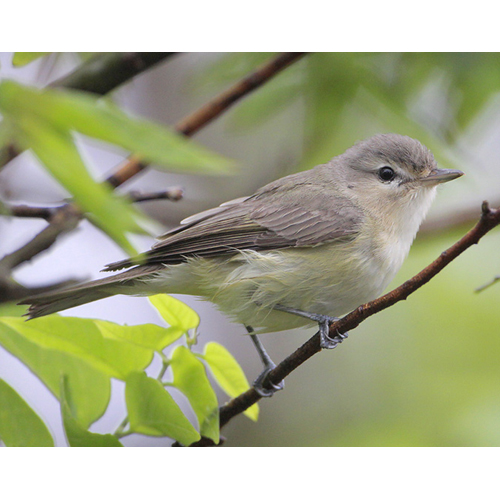 Warbling Vireos forage mostly high in the treetops, where they move along twigs and branches, looking for food among the leaves.