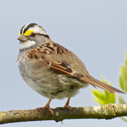 White-throated Sparrows usually forage on the ground in loose flocks, kicking the leaf litter back with both feet to uncover food. They will come to bird feeders if there is cover nearby. During the breeding season, they sing from trees, although they usually do not sing from very exposed perches. The two color morphs have a number of interesting behavioral differences. Either sex can be white-striped or tan-striped, but they usually pair with a member of the other color morph. Pairs of tan-striped females and white-striped males nest in more open forest and forest edge areas. Pairs of white-striped females and tan-striped males tend to nest in denser forests. Pairs of white-striped females and tan-striped males usually form pair bonds more quickly than the reverse combination. White-striped birds tend to be dominant. White-striped males are usually more aggressive and sing more than tan-striped males. They are also more likely to seek extra-pair copulations than tan-striped males. White-striped females also sing, but their tan-striped counterparts usually do not. Tan-striped adults tend to provide more food and care for the young than white-striped birds.