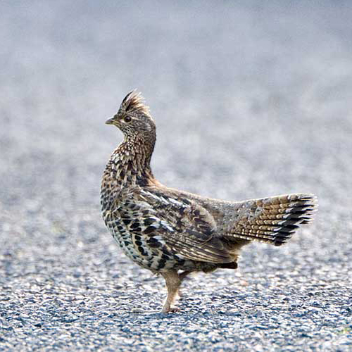 The Ruffed Grouse is a medium-sized bird measuring approximately 17' in length. The bird is the size and shape of a small chicken, with two distinct color morphs, gray and red. Both forms are cryptically patterned with black and white barring. The tail has a dark band at the end, with a lighter tip, which, like the dark ruff around the neck, is evident when fanned open. A white eye-line, small crest on top of the head, and a short, curved bill are other distinguishing characteristics.
